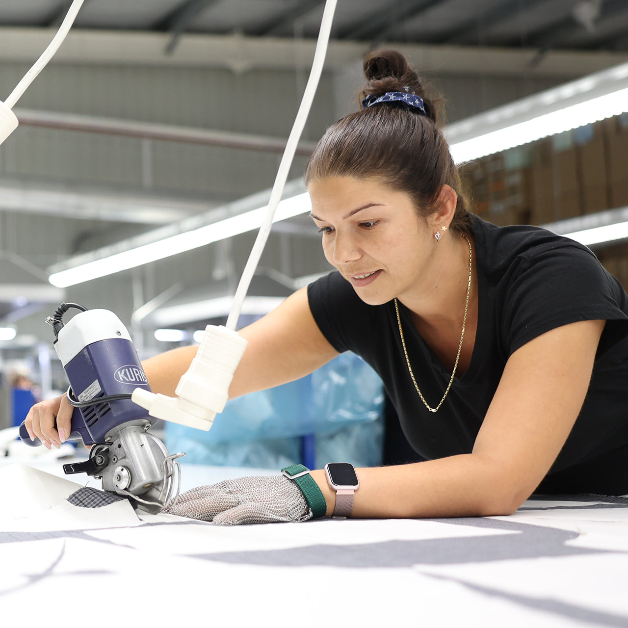 Person working with fabric and a large screen printer in a factory settingPerson working with fabric and a large screen printer in a factory setting