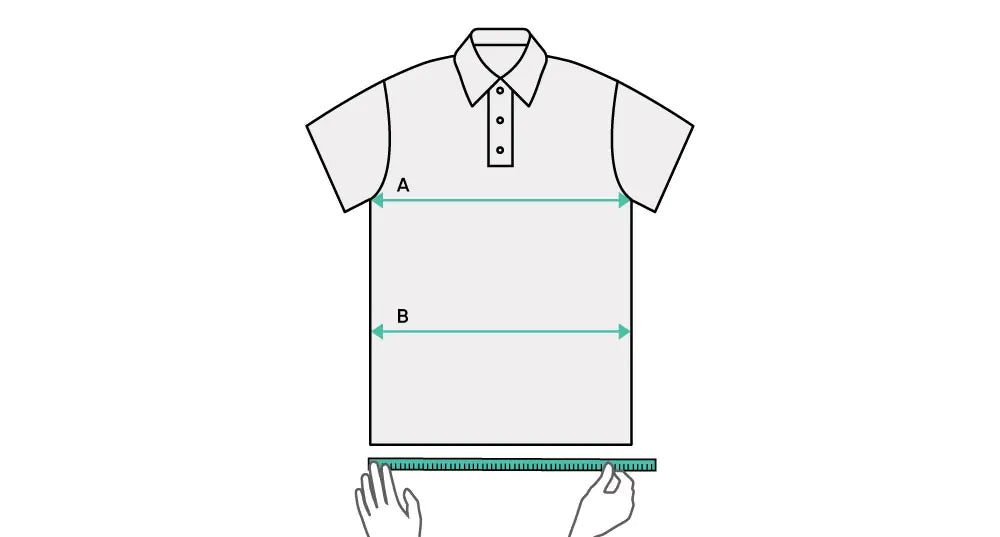 Prendere una maglietta ben aderente e stenderla su un tavolo. Se è una camicia o una polo, è importante chiudere i bottoni. Per determinare la misura del busto, misurare sotto il giromanica da sinistra a destra (A). Misurare quindi il girovita (B).